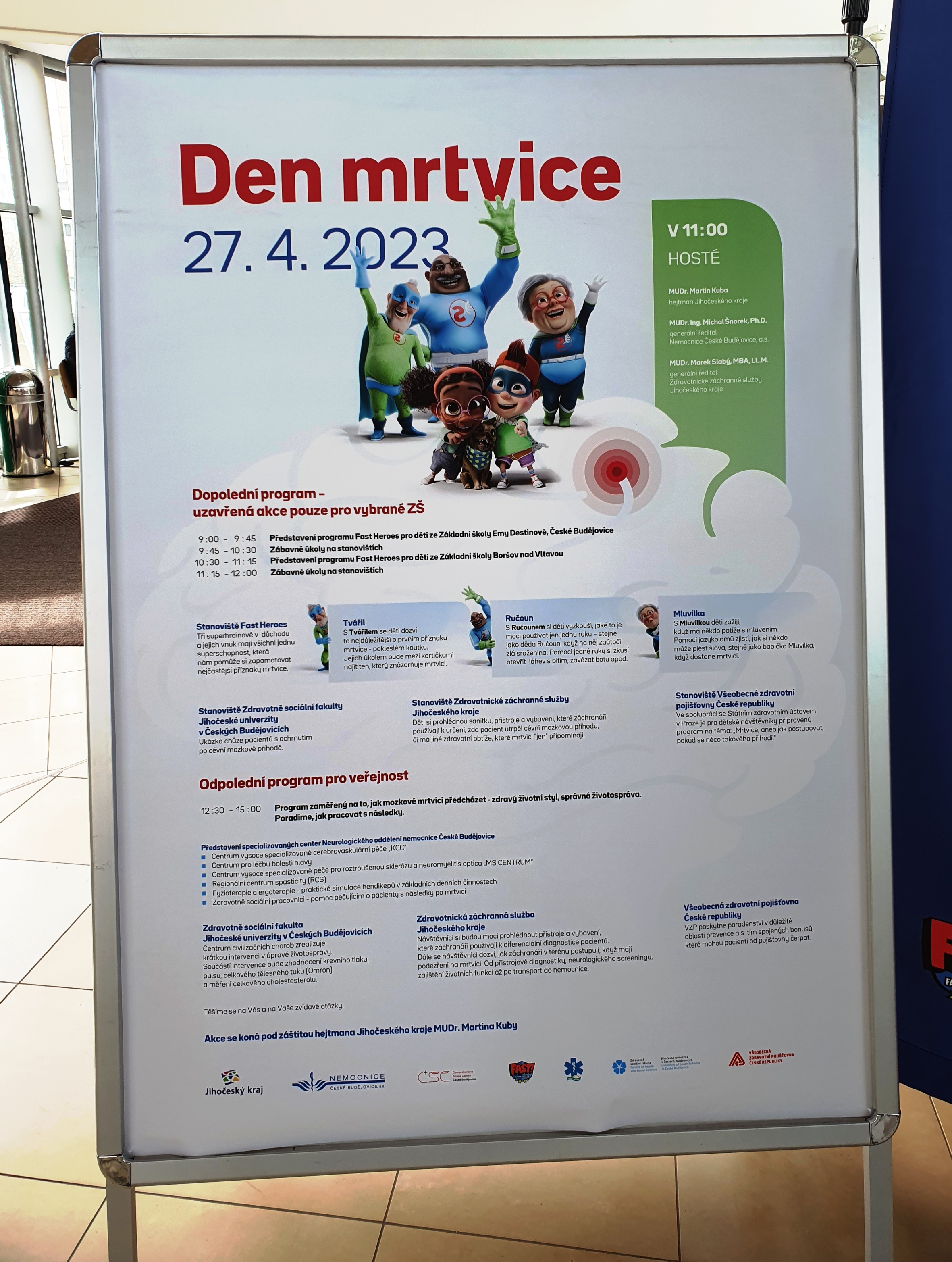 V terminálu českobudějovické nemocnice proběhla ke Dni mrtvice 27.4.2023 akce pro veřejnost, kde byl mj. představen vzdělávací program "Fast Heroes", který děti učí rozpoznat příznaky cévní mozkové příhody. Vzdělávací iniciativa využívá dětského nadšení pro učení i sdílení a povzbuzuje děti, aby nové poznatky předaly svým rodinám, zejména prarodičům. Pacienti s mrtvicí potřebují co nejrychleji kvalitní lékařskou péči, proto zvyšování povědomí o příznacích tohoto onemocnění pomáhá zachraňovat životy.