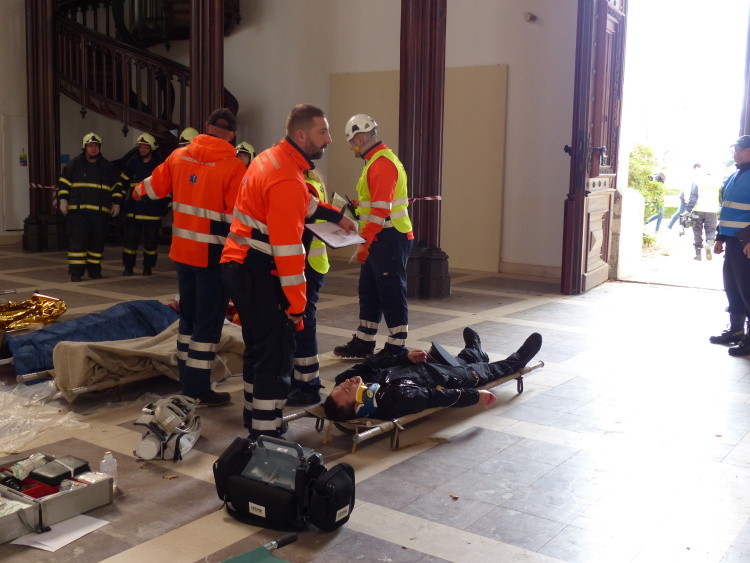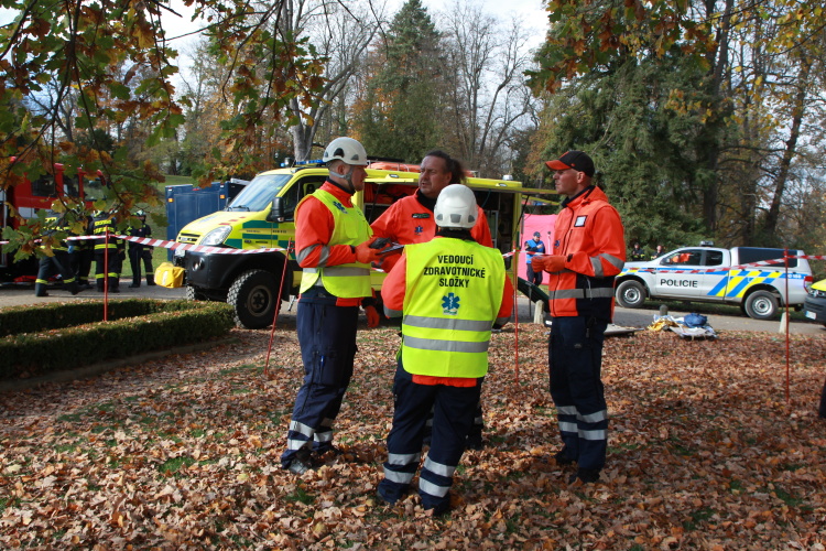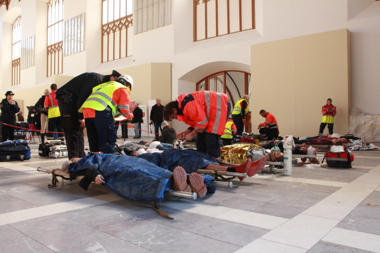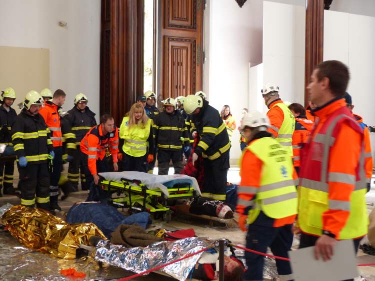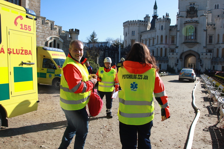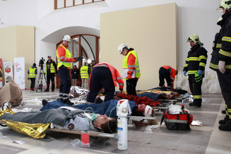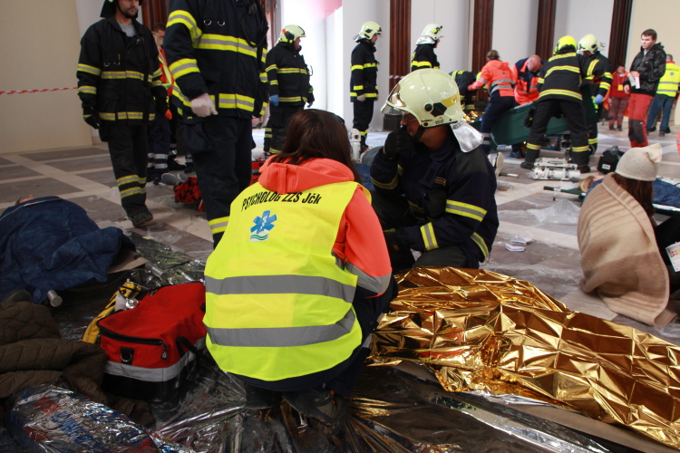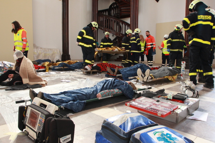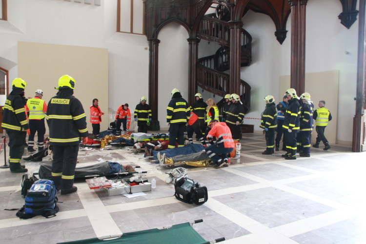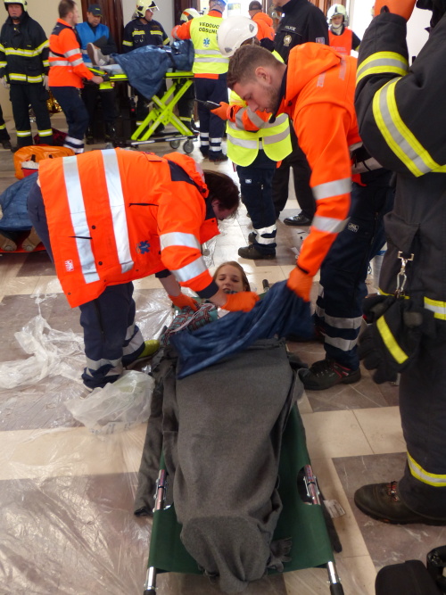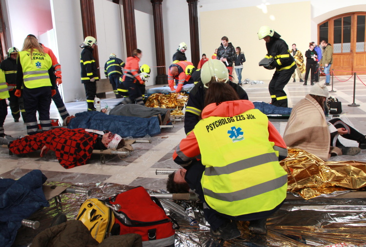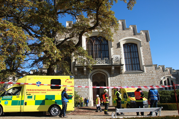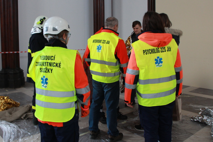 Vedoucí výjezdové skupiny ZZS JčK informovala o výbuchu a vzniku mimořádné události s hromadným postižením osob Zdravotnické operační středisko. Řídící operátor aktivoval Traumatologický plán ZZS JčK a vyslal na místo další výjezdové skupiny včetně vozidla pro řešení následků mimořádných událostí. Činnost zdravotnického personálu byla na místě události koordinována Vedoucím zdravotnické složky. Primární třídění osob v místě výbuchu prováděli profesionální hasiči a vynášeli zraněné do vnější, bezpečné zóny. Zde si je přebírali do péče členové výjezdových skupin ZZS JčK. Jako místo k poskytování přednemocniční neodkladné péče byly zvoleny prostory Alšovy Jihočeské galerie. Vedoucí lékařka provedla přetřídění pacientů, stanovila u každého potřebnou terapii a prioritu ošetření a transportu. Po ošetření byli pacienti cvičně směrováni do zdravotnických zařízení dle informací o dostupných lůžkových kapacitách jednotlivých nemocnic na území Jihočeského kraje.