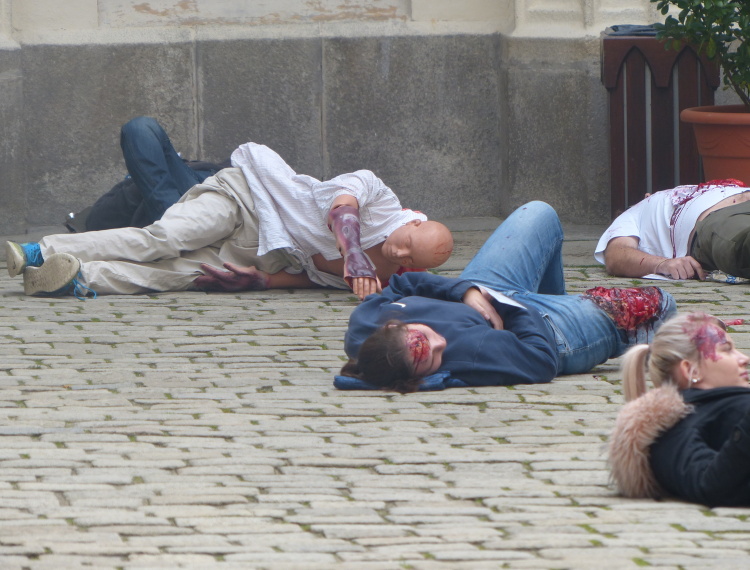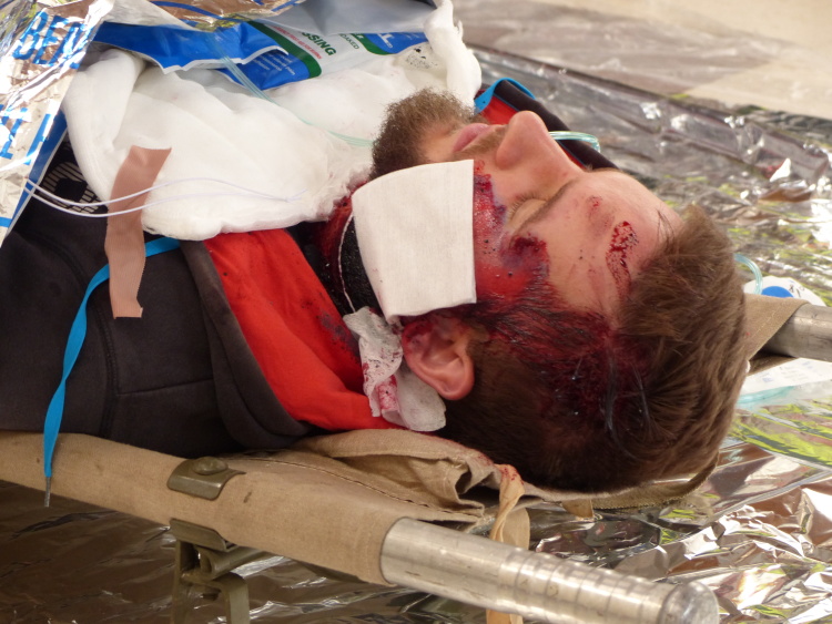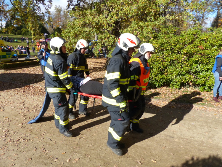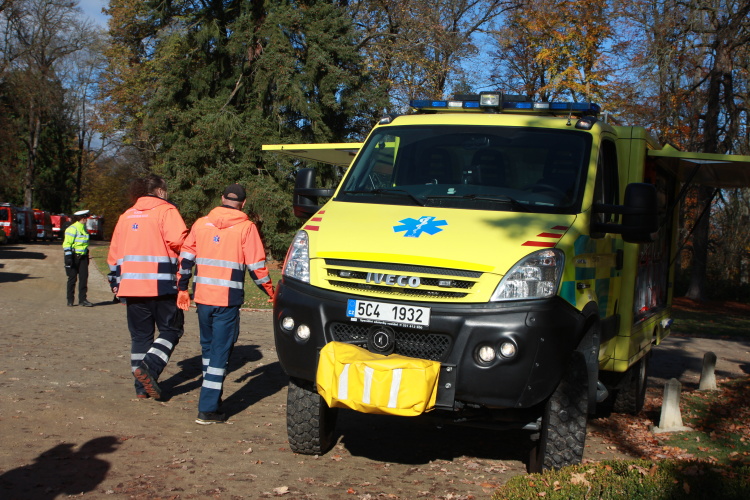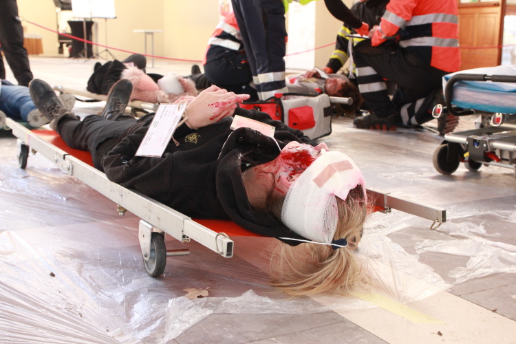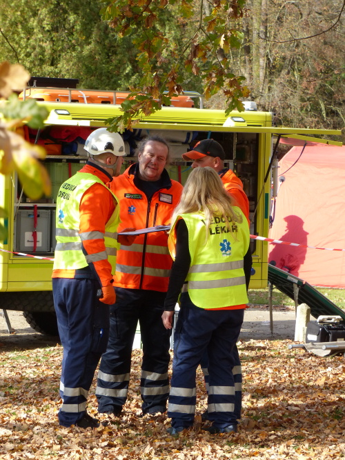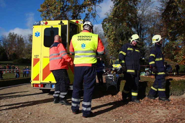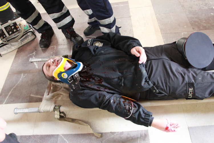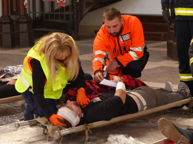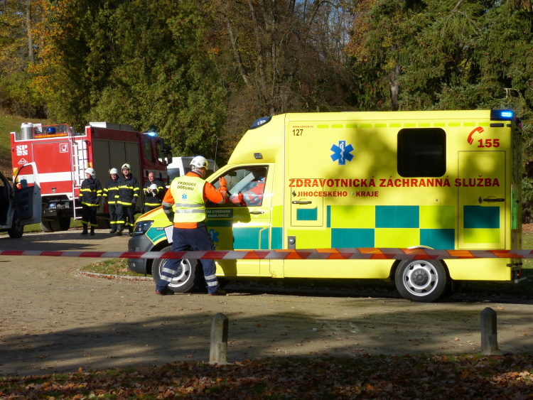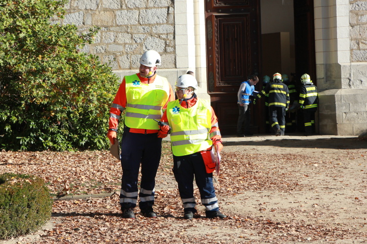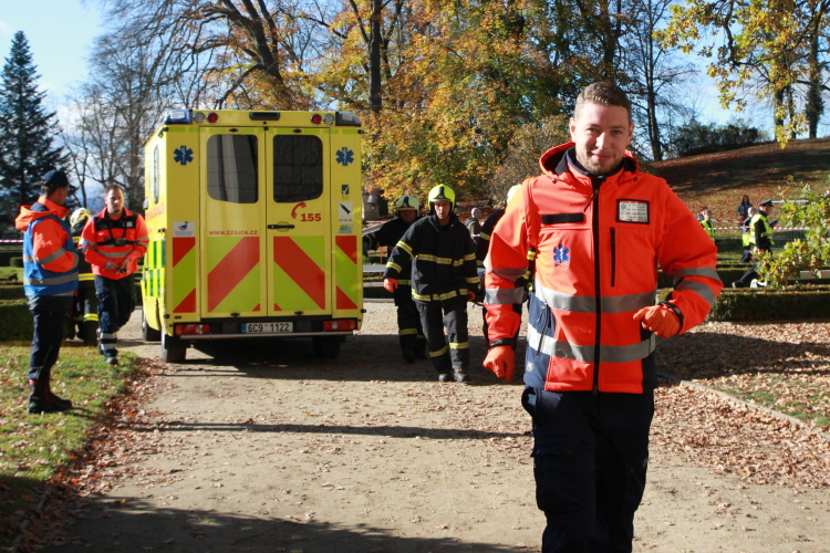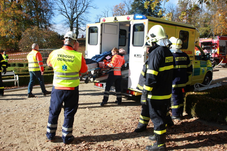Vedoucí výjezdové skupiny ZZS JčK informovala o výbuchu a vzniku mimořádné události s hromadným postižením osob Zdravotnické operační středisko. Řídící operátor aktivoval Traumatologický plán ZZS JčK a vyslal na místo další výjezdové skupiny včetně vozidla pro řešení následků mimořádných událostí. Činnost zdravotnického personálu byla na místě události koordinována Vedoucím zdravotnické složky. Primární třídění osob v místě výbuchu prováděli profesionální hasiči a vynášeli zraněné do vnější, bezpečné zóny. Zde si je přebírali do péče členové výjezdových skupin ZZS JčK. Jako místo k poskytování přednemocniční neodkladné péče byly zvoleny prostory Alšovy Jihočeské galerie. Vedoucí lékařka provedla přetřídění pacientů, stanovila u každého potřebnou terapii a prioritu ošetření a transportu. Po ošetření byli pacienti cvičně směrováni do zdravotnických zařízení dle informací o dostupných lůžkových kapacitách jednotlivých nemocnic na území Jihočeského kraje.