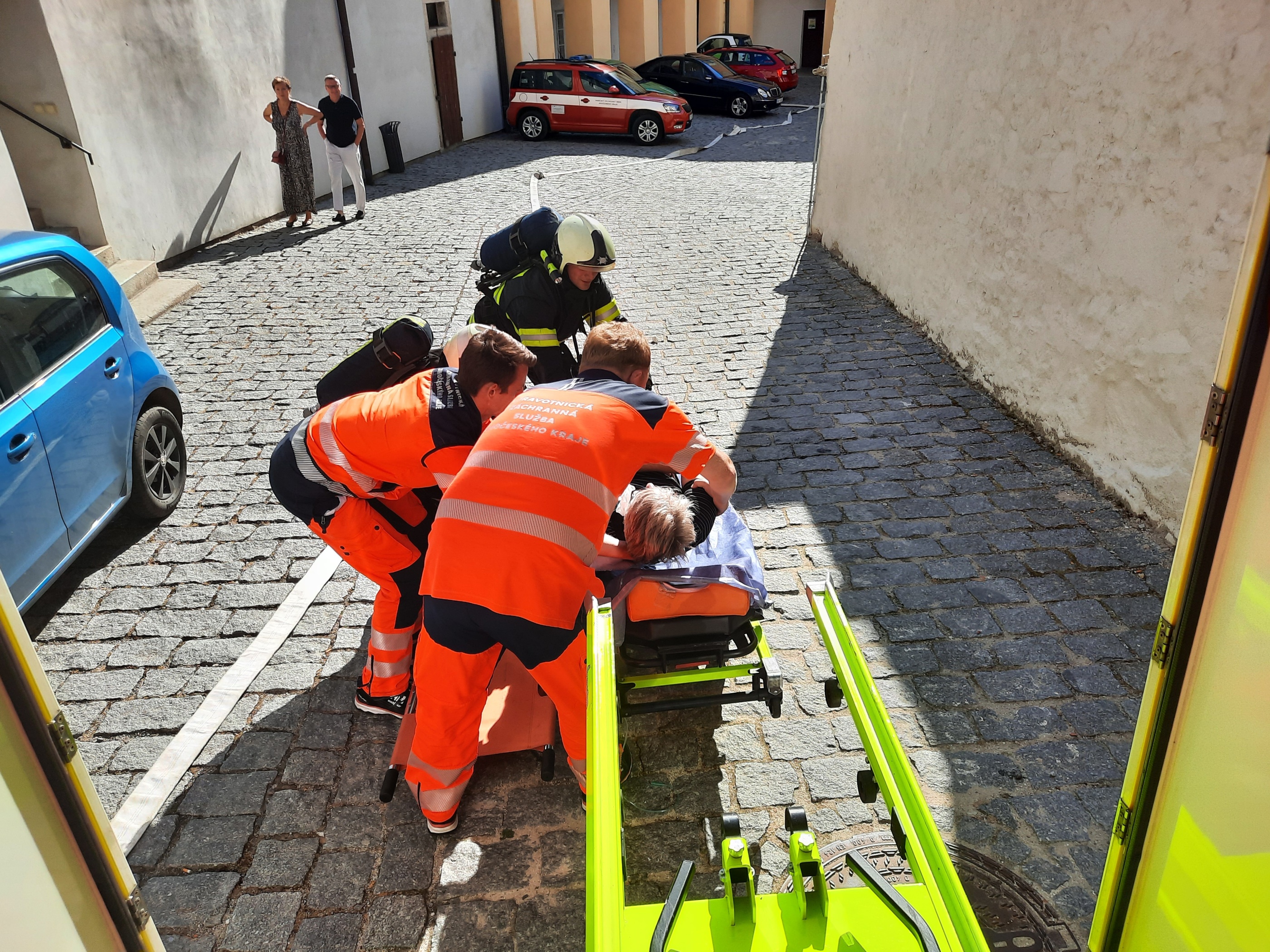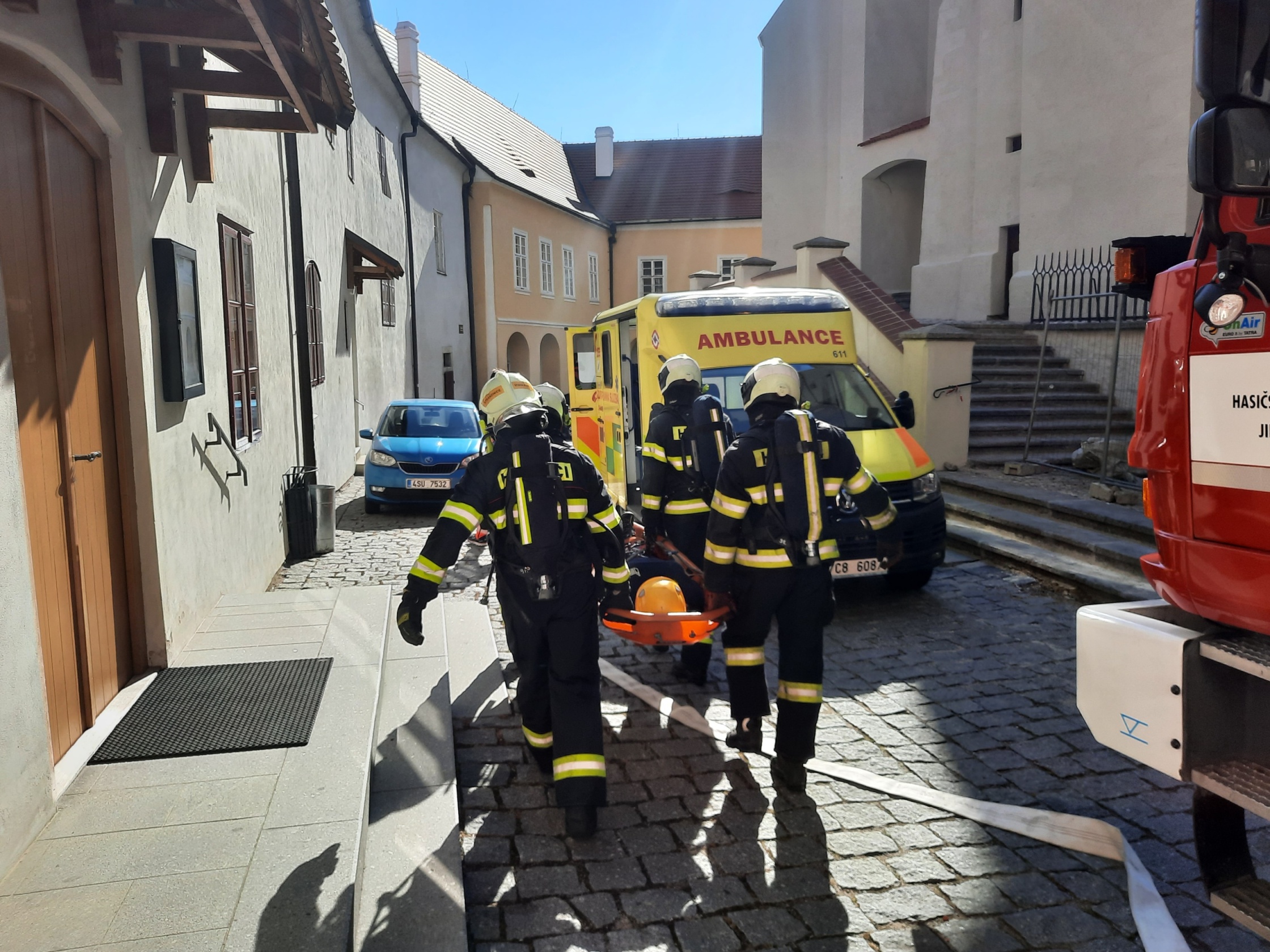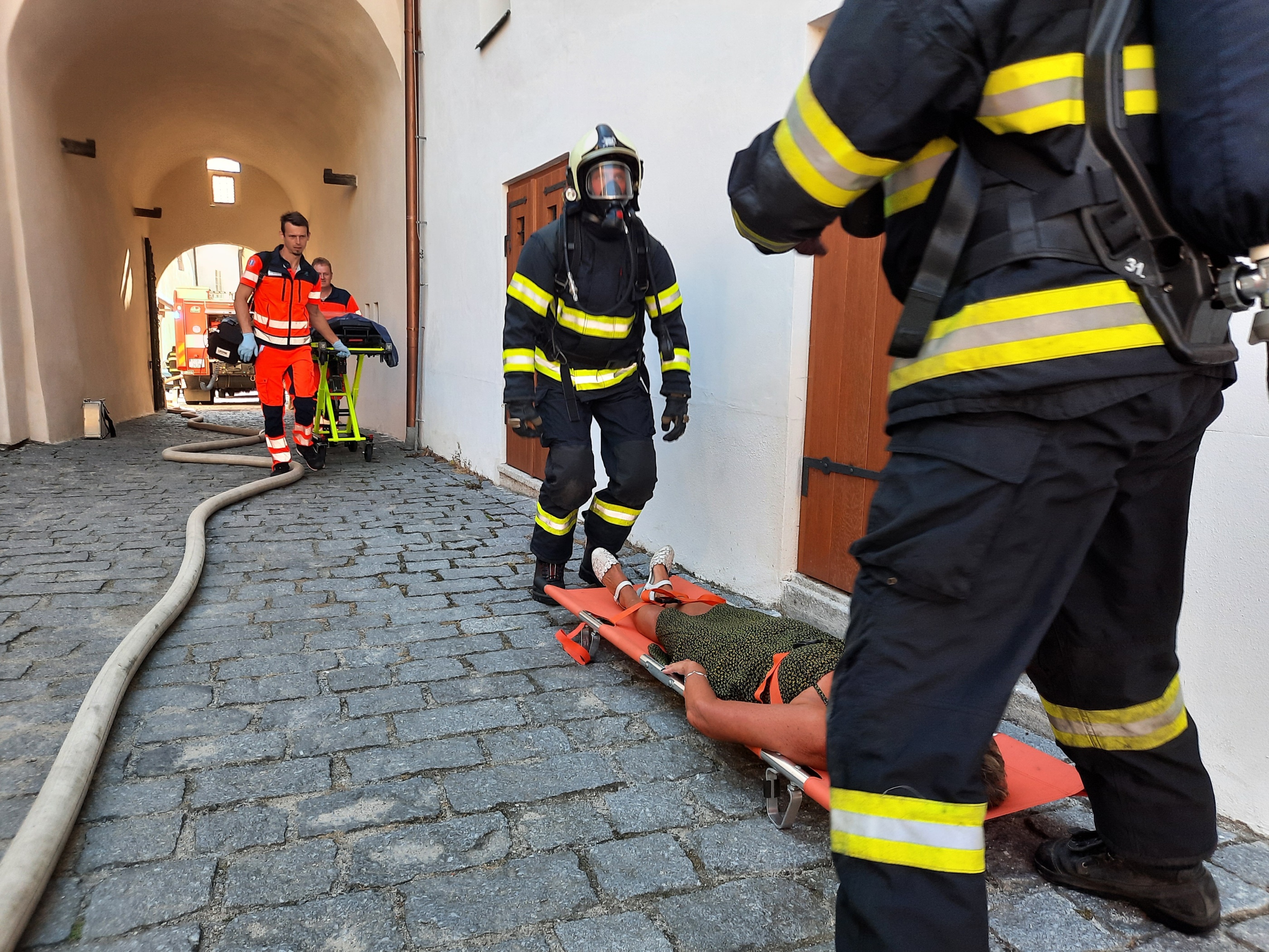 Následně se členové výjezdové skupiny přesunuli do určeného prostoru na hradním nádvoří, kde vyčkali na provedení záchrany další osoby z hradního ochozu. Poté, kdy lezecké družstvo HZS JčK bezpečně evakuovalo zraněnou osobu, byla předána do péče výjezdové skupině Zdravotnické záchranné služby JčK k poskytnutí přednemocniční neodkladnou péči a následnému transportu do zdravotnického zařízení k dalšímu nezbytnému ošetření.