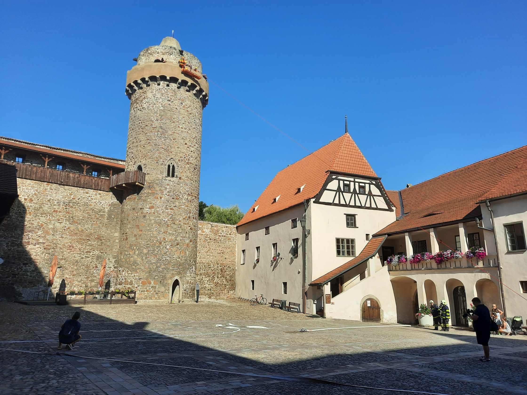 Ve čtvrtek 4. srpna proběhlo taktické cvičení složek Integrovaného záchranného systému, jehož námětem byla záchrana osob pomocí lanových technik z ochozu věže Rumpál, nacházející se v areálu strakonického hradu.